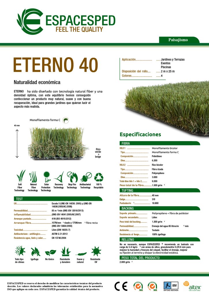 ETERNO 40 ofrece una altura de fibra de 40 mm, fabricada con polietileno de alta calidad que proporciona una textura suave y una apariencia natural. Su construcción densa asegura que el césped se mantenga en perfectas condiciones incluso bajo condiciones de uso intenso.