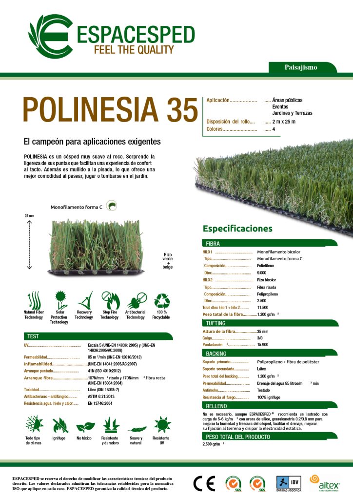 POLINESIA 35 redefine el concepto de césped artificial, combinando lujo y funcionalidad para ofrecer un producto superior en todos los aspectos. Con su apariencia natural, confort excepcional y mínima necesidad de mantenimiento, es la elección perfecta para quienes desean un espacio exterior hermoso y práctico. Descubre cómo POLINESIA 35 puede transformar tu jardín en un oasis de elegancia y confort.